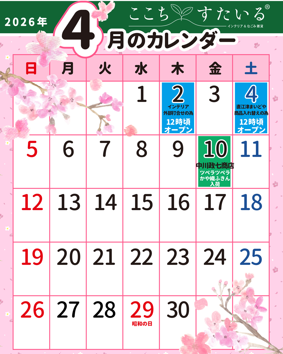 ここちカレンダー お休み・営業時間変更のお知らせ 4月2日:12時頃オープン 4月4日:12時頃オープン と、させていただきます。 どうぞよろしくお願いいたします。 (4月1日現在の予定です。) なお、都合により事前告知なしに閉店や 開店・閉店時間が前後する場合がございます。 どうぞよろしくお願いいたします。
