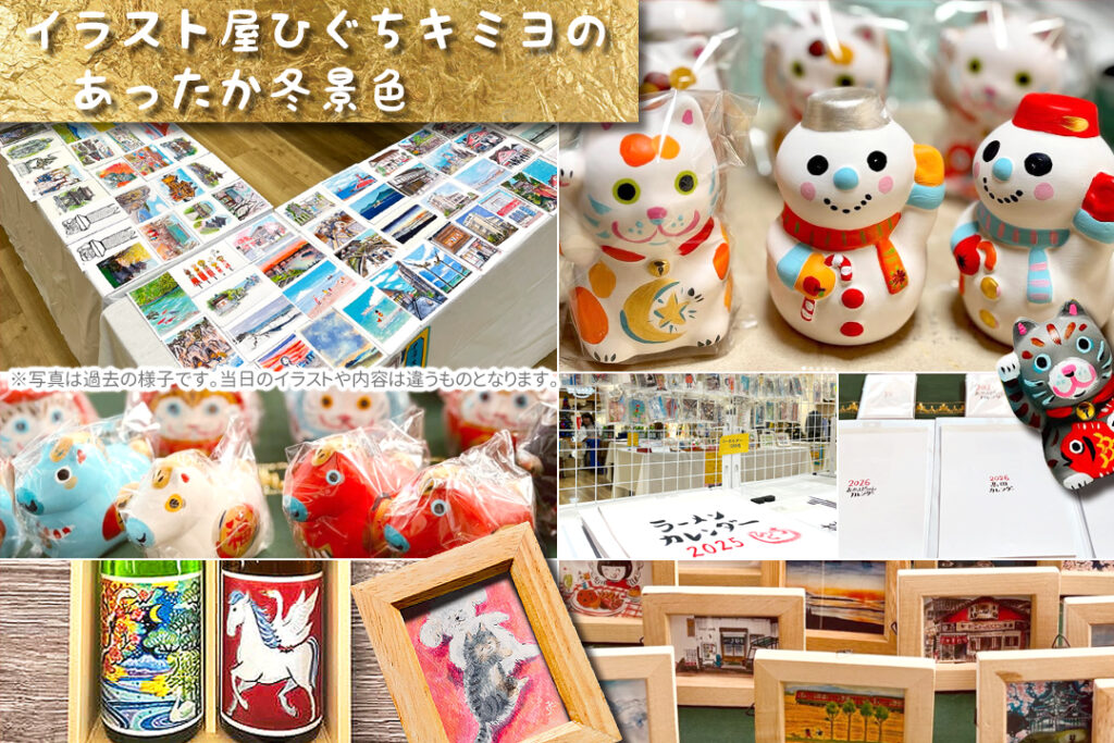 ●イラスト屋ひぐち:2026年版・完全新作オリジナルカレンダー発売 / 毎年人気の種類豊富なカレンダーたち。卓上・壁掛けから選べます。 / 年賀状・クリスマスカード・季節のご挨拶。思い出まちなみ絵はがきたくさん / 招き猫・午の干支飾りなど、お飾りにおすすめの絵付け貯金箱や張り子たち
