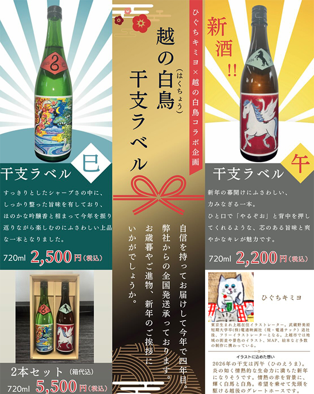 そして、今年もひぐちキミヨデザインの干支ラベル日本酒「越の白鳥」第四弾発表されました!