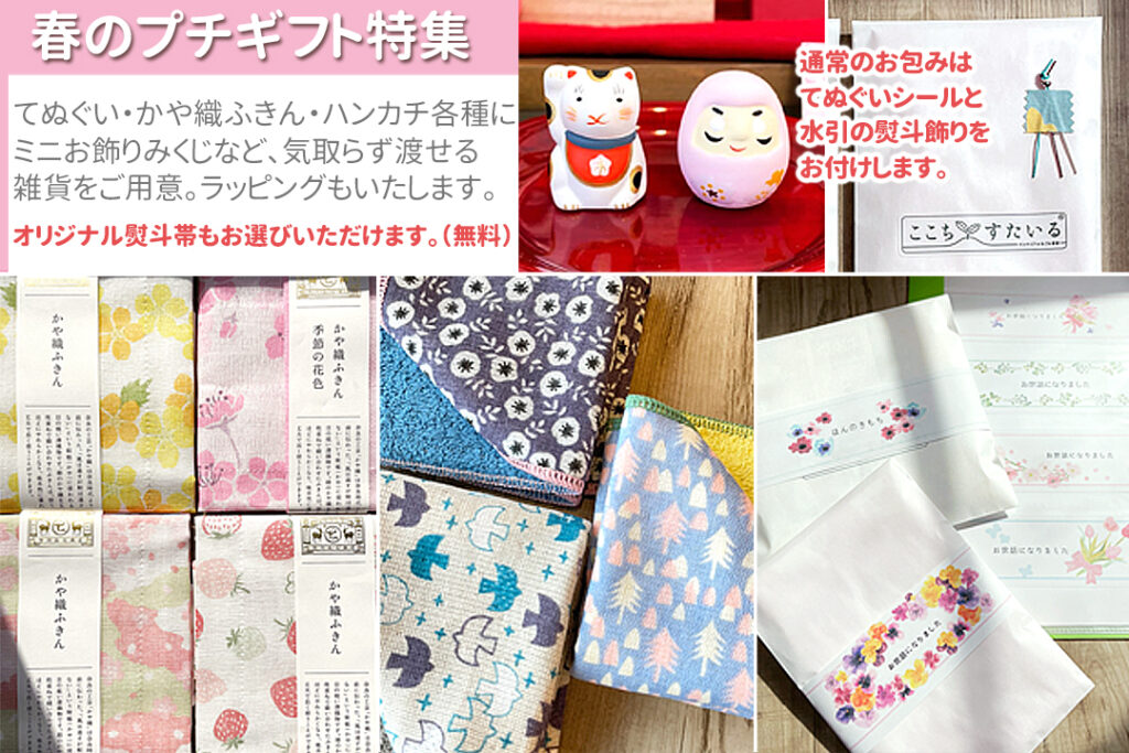 ●春のプチギフト特集:かや織ふきんやハンカチなど、ご挨拶やお礼のプチギフトにぴったりなアイテムを集めました。ご希望のお客様にラッピングはもちろん、オリジナルのお熨斗帯もお選びいただけます(無料)。