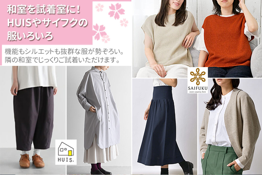 ●和室を試着室に!HUISやサイフクの服を多めにご用意:機能もシルエットも着回しも抜群な服をごそっと持っていきますよ。隣の和室でじっくりゆったりご試着いただけます。