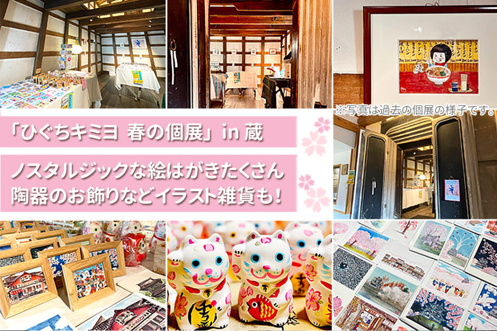 ●イラスト屋ひぐち:「ひぐちキミヨ 春の個展」in 蔵 春の風景を中心とした原画たち / 思い出・街並み・おかっぱちゃんに猫など、ノスタルジックな絵はがきたくさん / 桜な招き猫・様々なモチーフのだるまなど、お飾りにおすすめの絵付け貯金箱や張り子たち / キーホルダーやミニフレーム